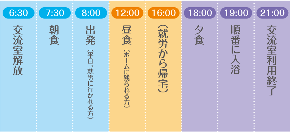 利用者様1人1人に合った個別の援助を行います。 相談・入浴・排せつ・食事の介助や健康管理・金銭管理の支援、ご家族・就労施設との連絡調整。 その他日常生活に必要な支援を行い、孤立の防止、生活への不安の軽減に努め、利用者様が安心して地域生活を送る日常の場を提供します。